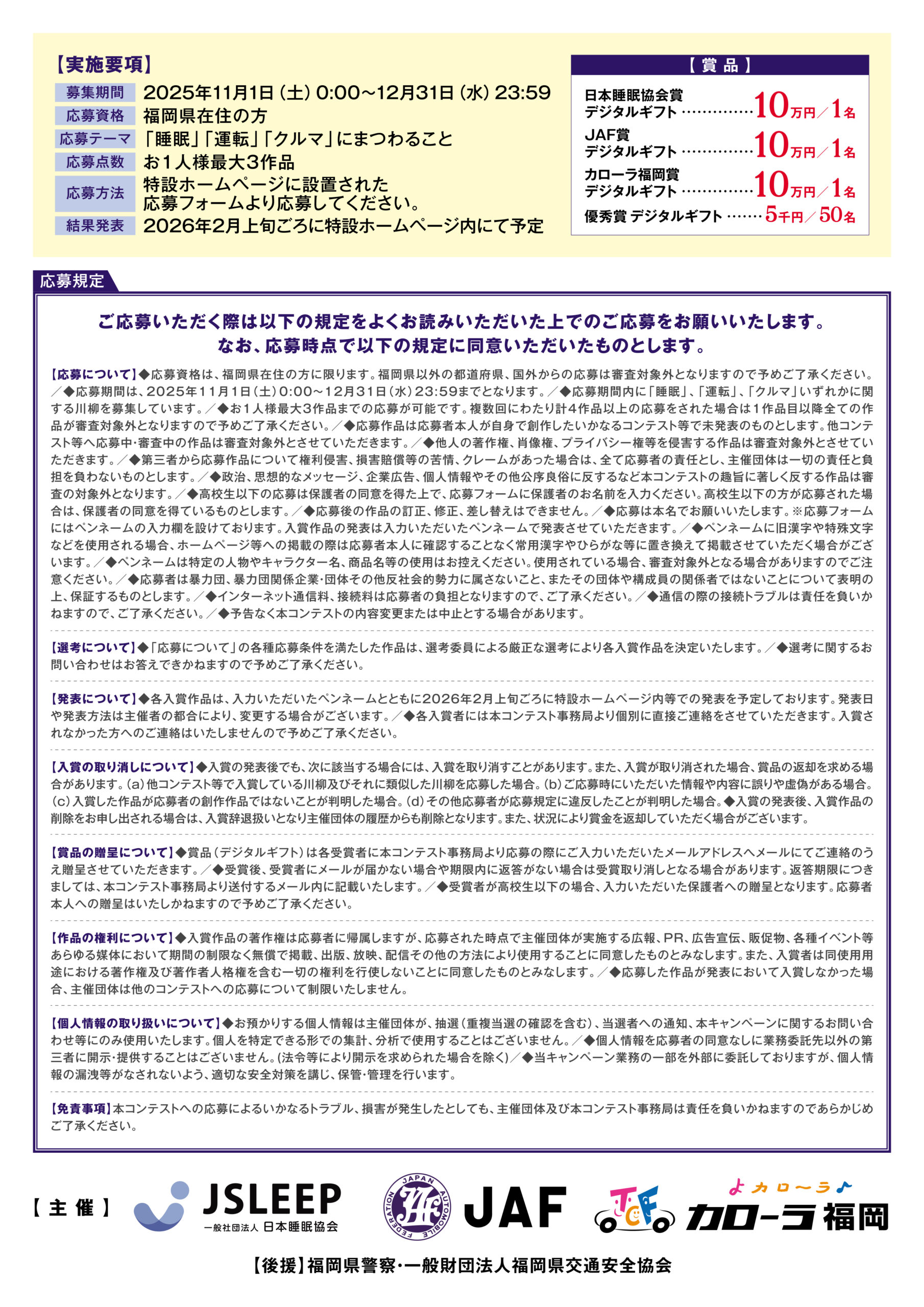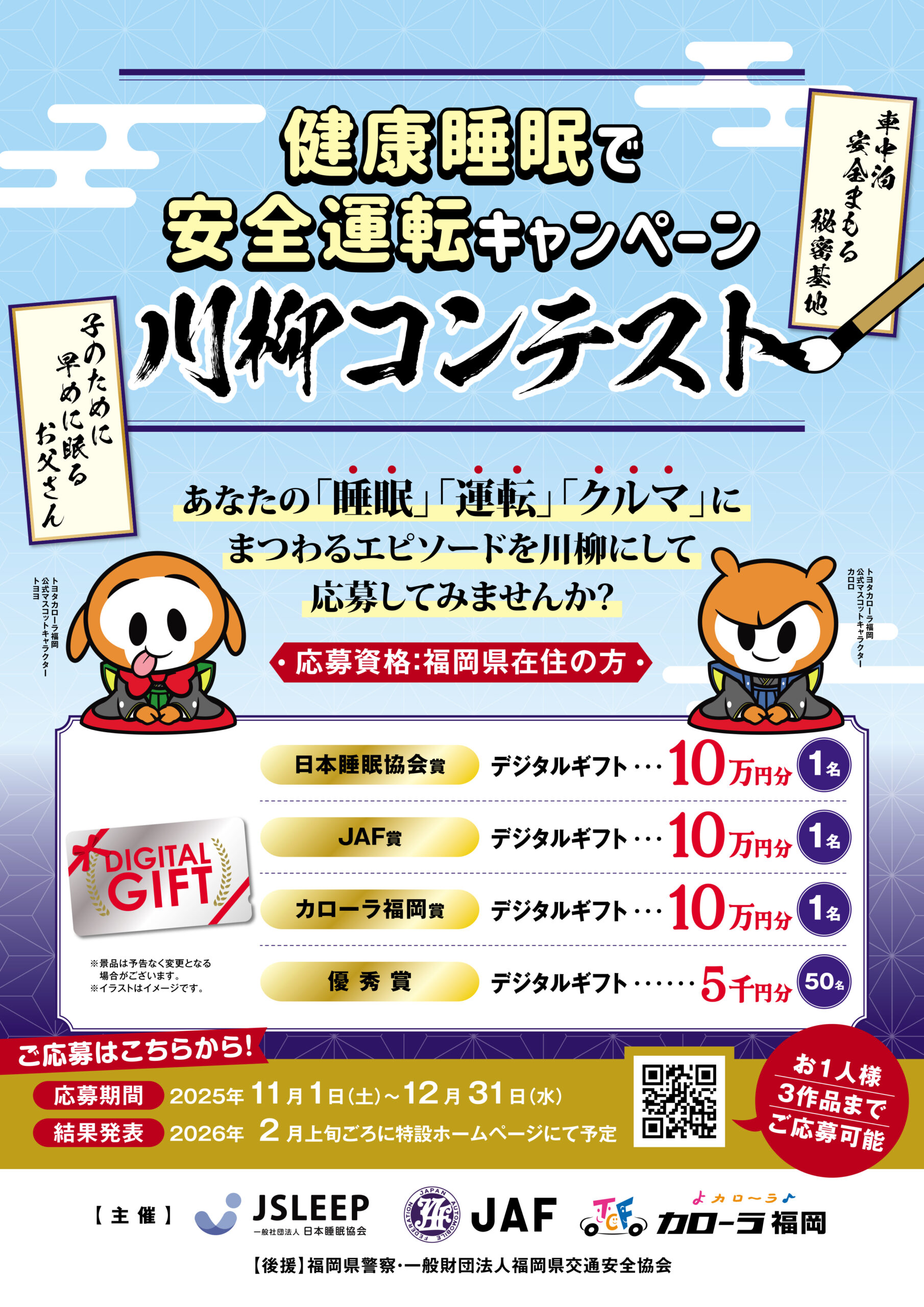 「睡眠から、人と社会を健やかに。」をキャッチフレーズに、睡眠に関する科学的根拠に基づいた情報の提供と具体的な施策の提案を行うことで、人々の睡眠を、より良いものにし、人と社会を健やかにしていくための活動を推進する一般社団法人日本睡眠協会(理事長:内村直尚、東京都文京区本郷)は、11月1日(土)から12月31日(水)の期間中、JAF福岡支部様、トヨタカローラ福岡株式会社様と三者共催で「健康睡眠で安全運転キャンペーン 川柳コンテスト」を開催中です。
